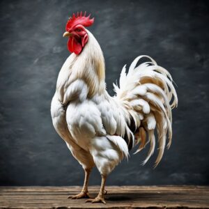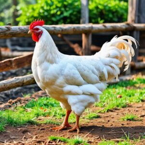 White Leghorn chickens are distinguished by their clean, bright all-white plumage and sleek, agile bodies. They possess a streamlined frame that promotes quick movements and an upright posture. Their striking appearance is further accentuated by a bright red comb and wattles, along with long, sturdy legs that support their active lifestyle.